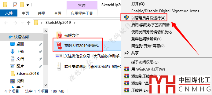 右鍵【草圖大師2019安裝包.exe】文件,選擇【以管理員身份運行】。