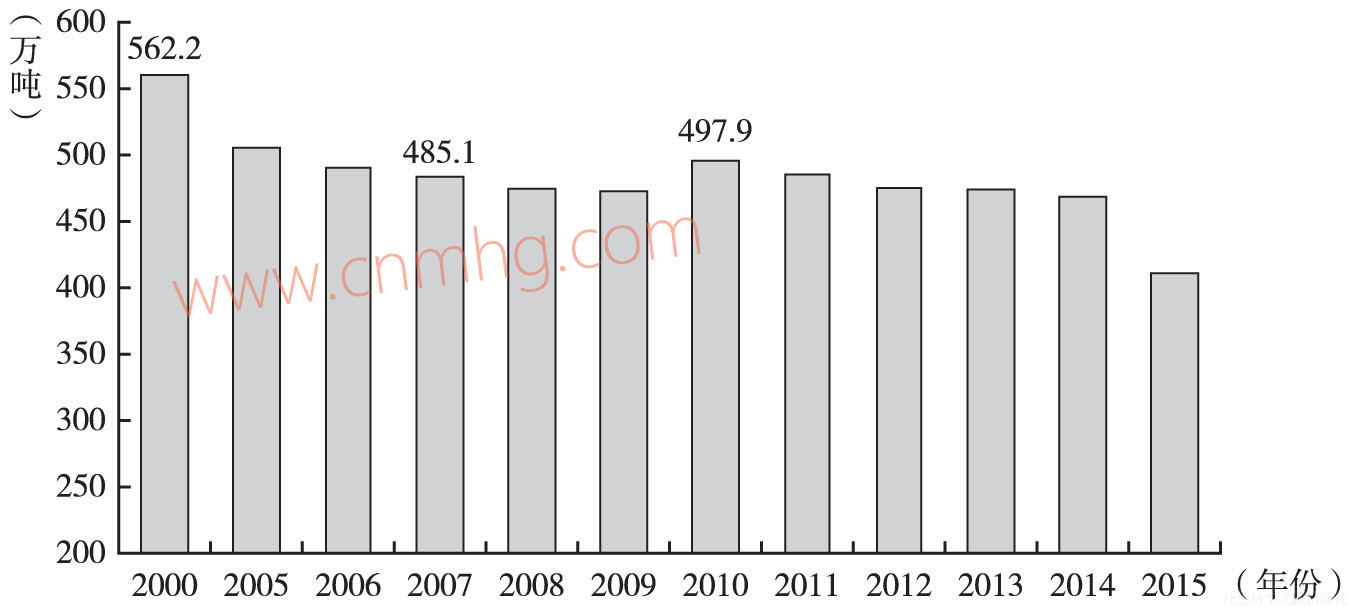 圖1 2000~2015年河南省原油產(chǎn)量變化情況