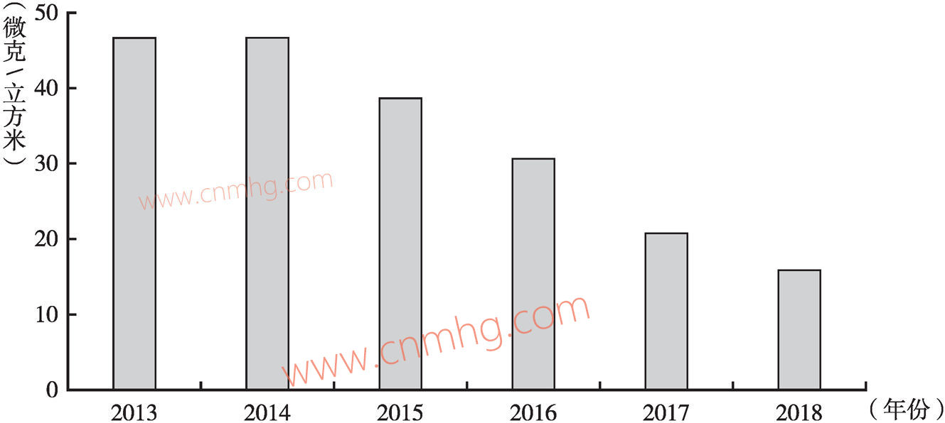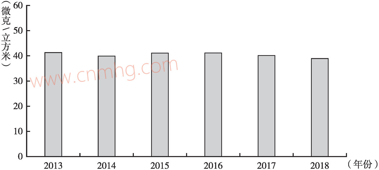 2018年,全省可吸入顆粒物年均濃度為103微克/立方米,整體呈現(xiàn)下降趨勢(shì),2018年較2013年下降18.9%,較2014年下降22.0%(見(jiàn)圖5)。