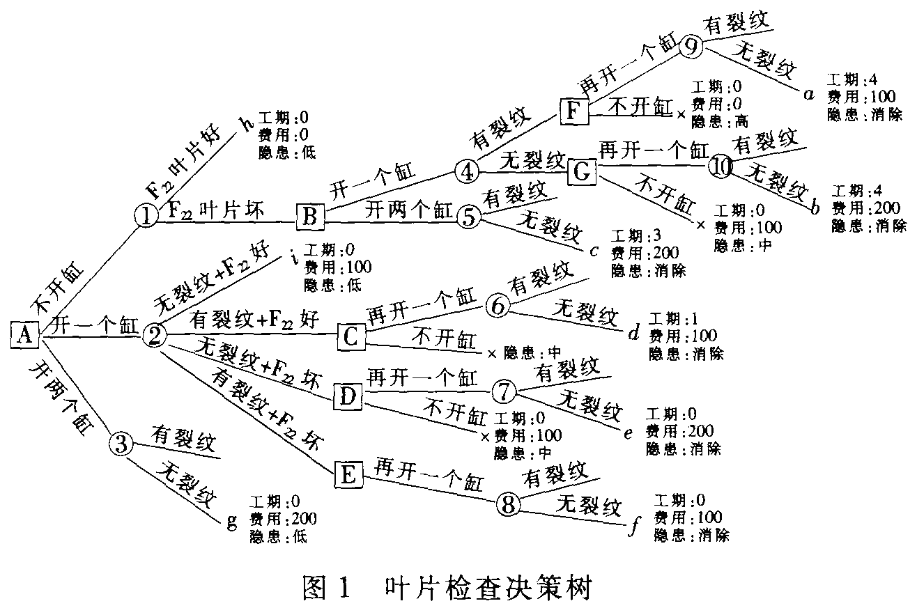 等可能性準(zhǔn)則的引入為在不確定信息情況下的維修決策如何遵循經(jīng)濟(jì)性原則提供了定量分析的手段。例如在大亞灣核電站的百萬千瓦汽輪機(jī)組大修中,在對(duì)1#低壓缸末級(jí)葉片進(jìn)行熒光磁粉探傷檢查時(shí),發(fā)現(xiàn)F22葉片的葉根槽上有三條長約50mm的異常顯示,可能是裂紋,但現(xiàn)場(chǎng)無法判斷,需將該異常葉片送回英國檢查后才能確定。但受大修工期的限制,必須現(xiàn)場(chǎng)立即決定是否對(duì)2#、3#低壓缸作全面檢查。如果能確認(rèn)F22葉片上確實(shí)有裂紋,也必須對(duì)另外兩臺(tái)低壓缸作開缸檢查。但英國廠方的檢測(cè)和確認(rèn)需要3~4天,一旦檢測(cè)結(jié)果出來后要求開缸檢查,大修工期則會(huì)損失3~4天,經(jīng)濟(jì)損失高達(dá)1千萬元。若選擇在英國廠方進(jìn)行檢測(cè)和確認(rèn)的同時(shí)開缸檢查,對(duì)大修工期的影響較??;若3~4天后F22葉片檢查結(jié)果是無裂紋,則額外承擔(dān)了開缸檢查的巨額費(fèi)用,以及開缸過程中的設(shè)備損壞風(fēng)險(xiǎn)。如果在這個(gè)案例中運(yùn)用等可能性準(zhǔn)則,就可假設(shè)F22葉片檢查結(jié)果好與壞具有相同的可能性。另外,如果決定開缸檢查,假設(shè)在葉片上查出有裂紋和無裂紋同樣具有相同的可能性,然后按以下步驟進(jìn)行分析、計(jì)算和決策:通過分析列出所有的備擇方案;畫出決策樹,排除不滿足合法性原則和安全可靠性原則的備擇方案;對(duì)其余的備擇方案計(jì)算所有自然狀態(tài)下的平均收益;選擇平均收益最大的或代價(jià)最小的備擇方案。