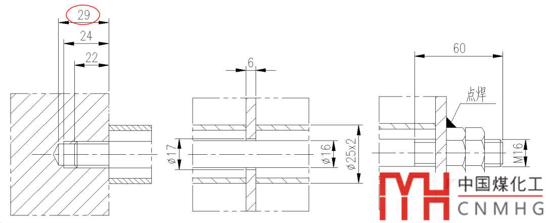 比如在某涉外項(xiàng)目中,焊接拉桿的節(jié)點(diǎn)如下,內(nèi)伸3~5mm,基本杜絕了拉桿孔開孔過深的問題。