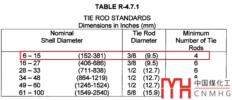 如果這臺(tái)DN350的設(shè)備按照TEMA設(shè)計(jì),那么會(huì)用什么樣的拉桿結(jié)構(gòu)呢?我們查一下TEMA的拉桿直徑,4-Φ9.5mm的拉桿就可以了。同樣的GB151的換熱器,需要4-Φ16mm。