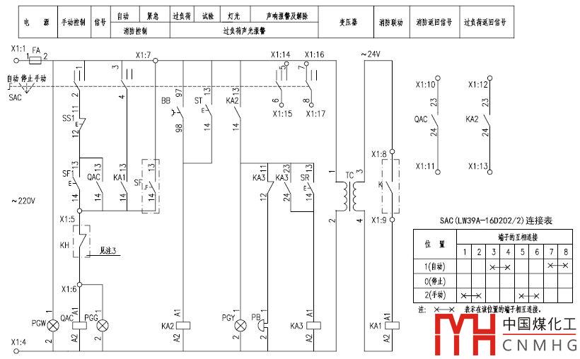 圖1以排煙、加壓風(fēng)機(jī)為例說(shuō)明自動(dòng)控制與手動(dòng)控制。圖中SAC為多位開(kāi)關(guān),也就是俗稱(chēng)的轉(zhuǎn)換開(kāi)關(guān),實(shí)現(xiàn)手動(dòng)、自動(dòng)轉(zhuǎn)換。當(dāng)SAC在手動(dòng)位置時(shí),按鈕SF1啟動(dòng)風(fēng)機(jī),SS1停止風(fēng)機(jī),相關(guān)原理在4月25日的文章中已經(jīng)說(shuō)明;當(dāng)SAC在自動(dòng)位置時(shí),自動(dòng)控制通過(guò)中間繼電器KA1(13-14)實(shí)現(xiàn),火災(zāi)時(shí),消防聯(lián)動(dòng)模塊無(wú)源動(dòng)合觸點(diǎn)K閉合,使中間繼電器線圈KA1通電,其動(dòng)合觸點(diǎn)KA1閉合,接觸器線圈QAC通電,接通主回路,風(fēng)機(jī)啟動(dòng)。