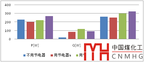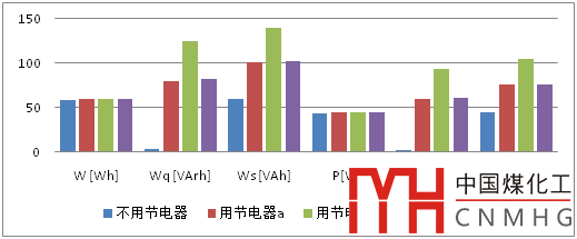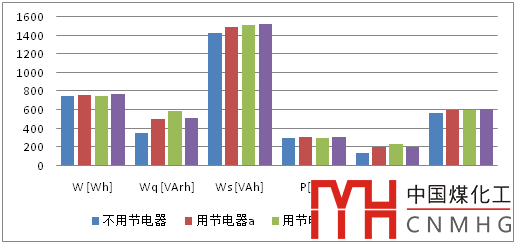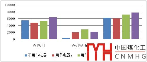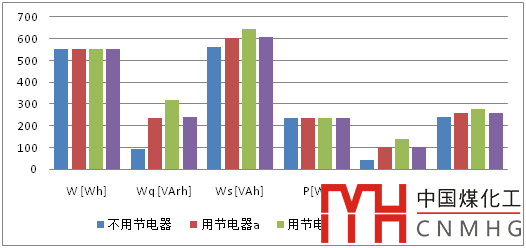 由表8、圖8和圖9可知,使用三種節(jié)電器對住戶有功電度和有功功率影響有大有小,增減幅度在13%以內(nèi);而對無功功率和無功電度成倍增加,影響十分明顯;視在功率和視在電度在多數(shù)情況下呈現(xiàn)增加的特征。