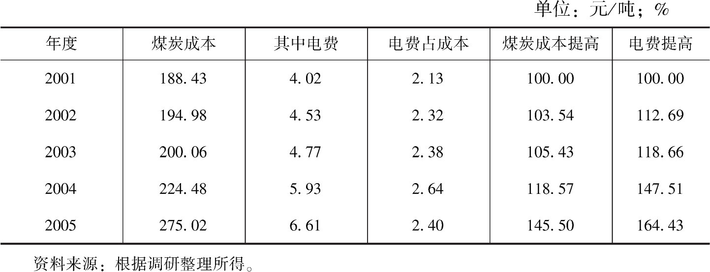 從上表可以看出近五年來,電費(fèi)在煤炭成本中所占的比重逐年提高,提高的幅度都大大超過了煤炭成本增加的幅度,而且,2004年6月煤電價(jià)格聯(lián)動(dòng)政策出臺(tái)后,電費(fèi)提高超過煤價(jià)提高10個(gè)百分點(diǎn)。