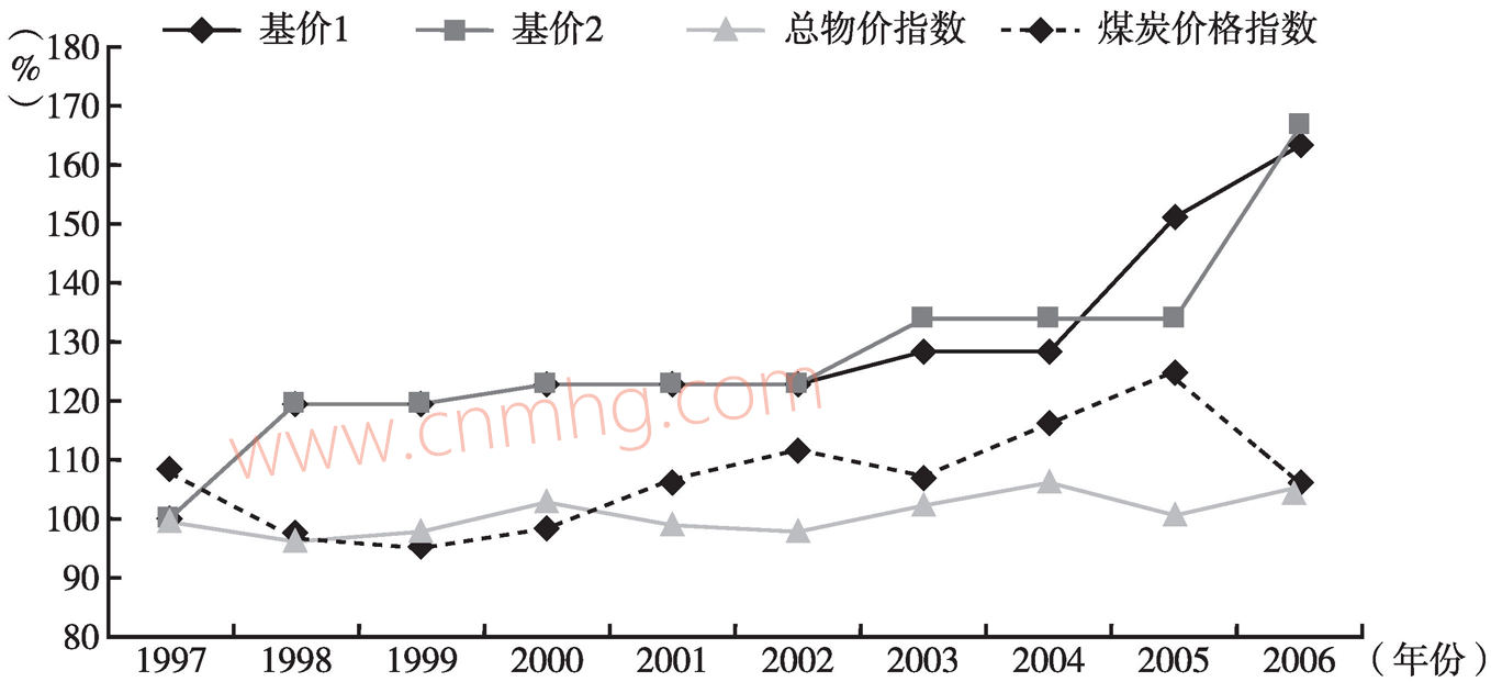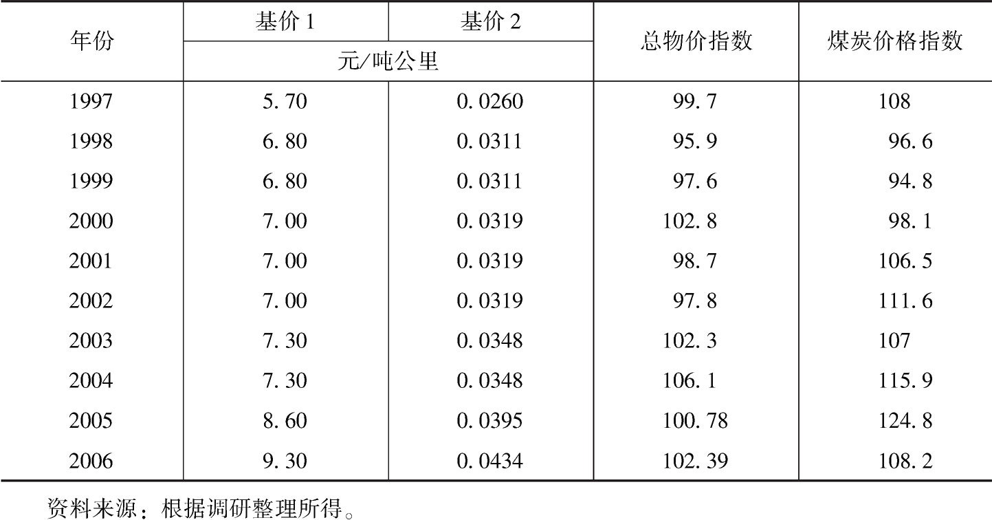 表2 1997年以來鐵路運(yùn)價(jià)變化情況表、總物價(jià)指數(shù)、煤炭?jī)r(jià)格指數(shù)
