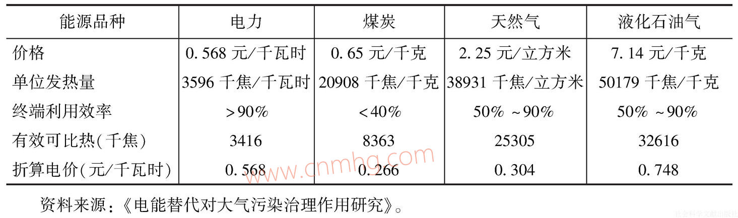 影響用戶用能的主要因素之一是能源價(jià)格,用戶對能源價(jià)格的接受程度決定了該能源品種的市場競爭力。目前,用戶終端用能種類主要分為電力、煤炭、天然氣和液化石油氣四大類,全部折算成電價(jià)后,等效電價(jià)分別是每千瓦時0.568元、0.266元、0.304元和0.748元(見表1),電能對于油品的替代具有較強(qiáng)的競爭力。但是,現(xiàn)行的價(jià)格體系沒能反映能源的環(huán)境成本,使清潔能源的綜合效益未能全部體現(xiàn)出來;此外,用戶在考慮能源使用價(jià)格時,還需對設(shè)備的初始投資、運(yùn)行維護(hù)費(fèi)、設(shè)備壽命等進(jìn)行綜合比較。