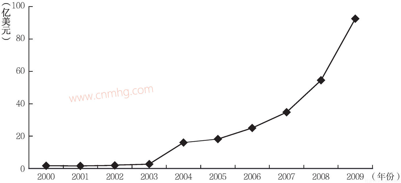 圖2 2000~2009年中國(guó)在海合會(huì)國(guó)家承包工程完成營(yíng)業(yè)額情況