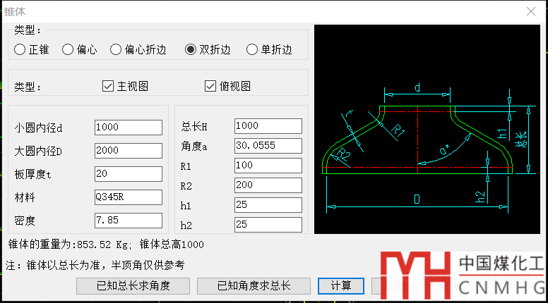 輸入數(shù)據(jù)以錐體總長(zhǎng)為準(zhǔn),用戶可以根據(jù)需要輸入半頂角計(jì)算總長(zhǎng),也可以輸入總長(zhǎng)求實(shí)際的半頂角。當(dāng)實(shí)際繪圖和計(jì)算時(shí),均以總長(zhǎng)數(shù)據(jù)為準(zhǔn),半頂角數(shù)據(jù)可以不輸入。