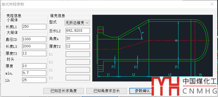 其中錐殼有兩種選項,無折邊錐殼或者雙折邊錐殼。為了更容易獲得錐殼長度和錐殼角度,增加了已知總長求角度和已知角度求總長。實際程序運(yùn)行中,以總長為準(zhǔn),角度作為參考。