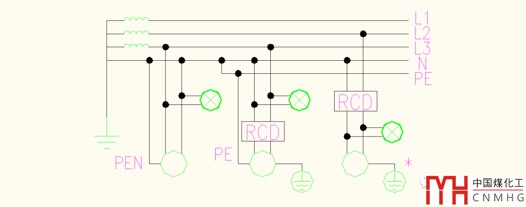圖2如圖1有所區(qū)別,L1、L2、L3、N、PE、PEN同上。左側(cè)用電設備也沒有采用RCD保護,實際上采用的是接零保護,設備外殼接PEN線(本質(zhì)上也就是N線);中間燈具同樣沒有采用RCD保護,而末端的設備采用RCD保護,PE線不穿過零序電流互感器,同時設備外殼又接地;右側(cè)設備均采用了RCD,這時的應用同樣需要核算用電設備正常泄漏電流,防止誤動作,設備外殼接地,也可以接PE。
