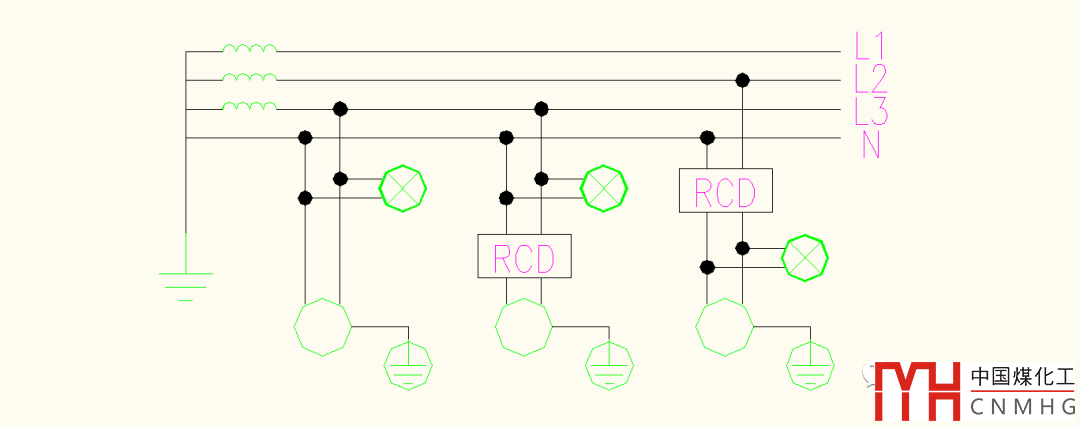 如圖3所示,左側(cè)用電設備同樣沒有采用RCD保護;中間燈具也沒有采用RCD保護,而末端的設備采用RCD保護,且設備外殼直接接地;右側(cè)設備均采用了RCD,設備外殼直接接地。