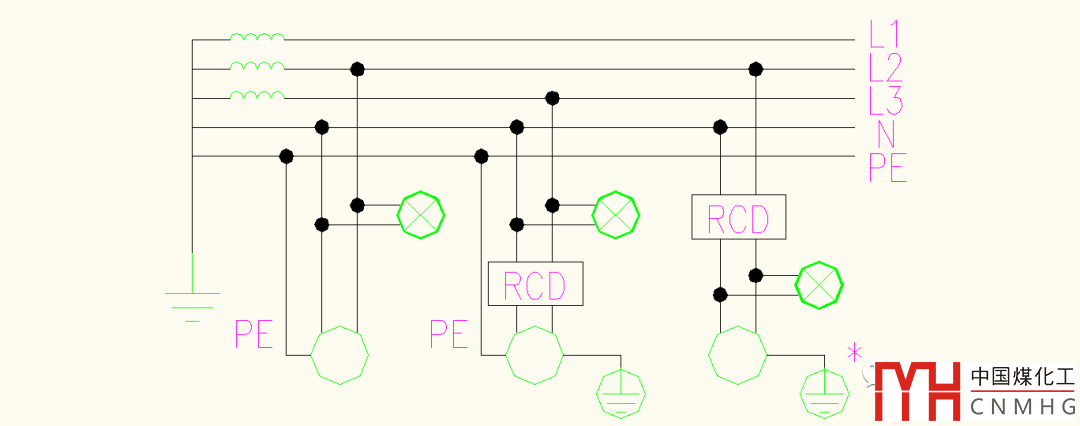 應該說明,上述各種系統(tǒng),圖中所有的接地線或PE線均不能穿過RCD的零序電流互感器,否則會影響RCD造成工作。