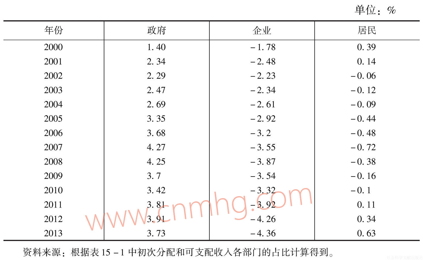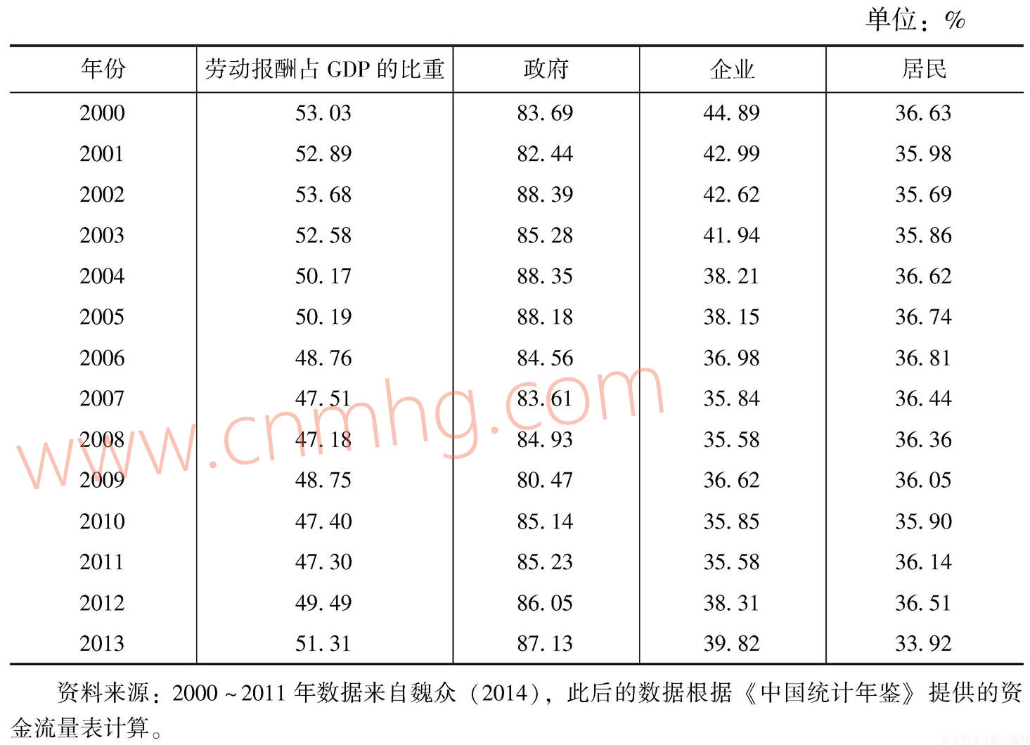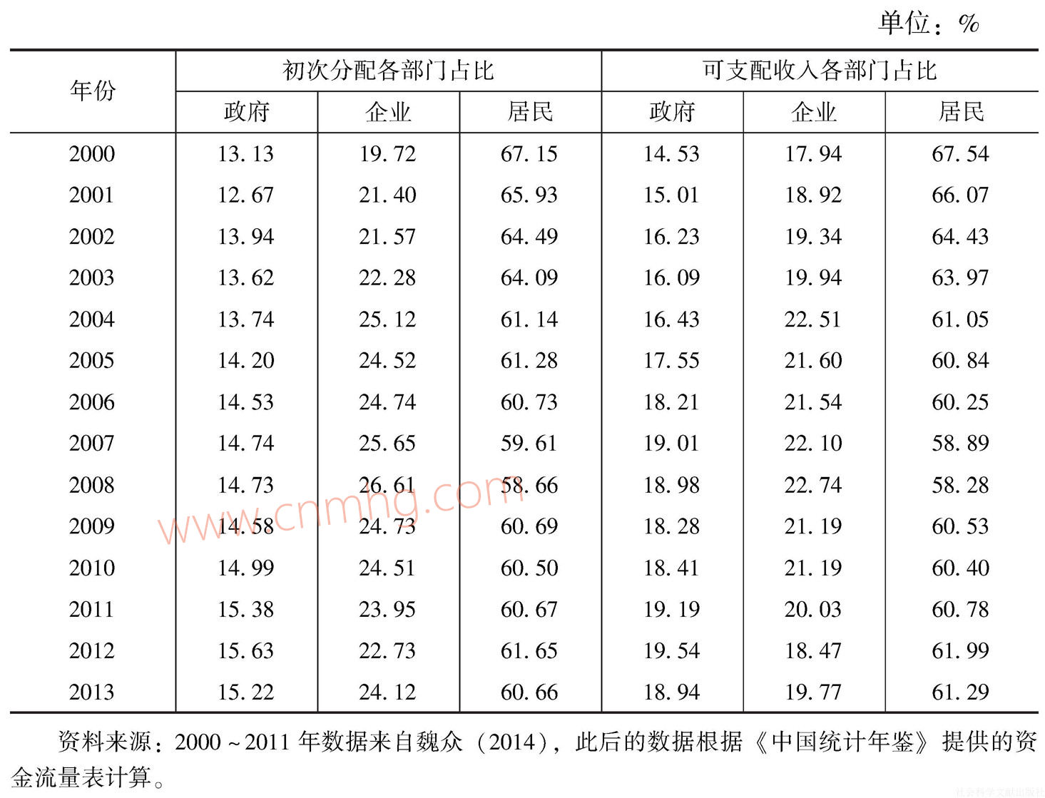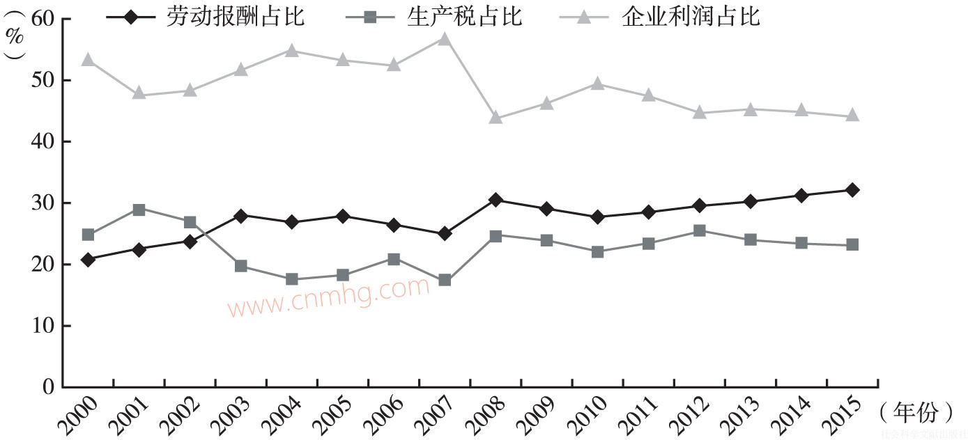考慮到國家統(tǒng)計(jì)局對2000年以來的資金流量表進(jìn)行了調(diào)整,導(dǎo)致2000年前后資金流量表數(shù)據(jù)存在一定的跳躍性。因此,我們僅使用2000年以來的資金流量表分析政府、企業(yè)和居民三大部門之間的收入分配格局。