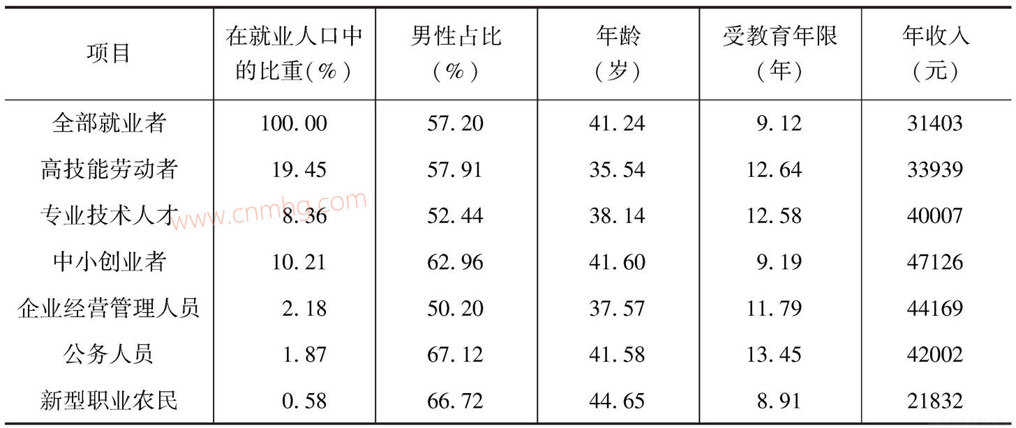 依據(jù)重點(diǎn)群體的定義,我們使用2013年的中國收入分配調(diào)查數(shù)據(jù)對重點(diǎn)群體的特征進(jìn)行描述。[3]從規(guī)模來看,在六大群體中高技能勞動(dòng)者占比最高,達(dá)到19.45%;其次是中小創(chuàng)業(yè)者和專業(yè)技術(shù)人才,分別達(dá)到10.21%和8.36%;新型職業(yè)農(nóng)民的占比最低,僅為0.58%。