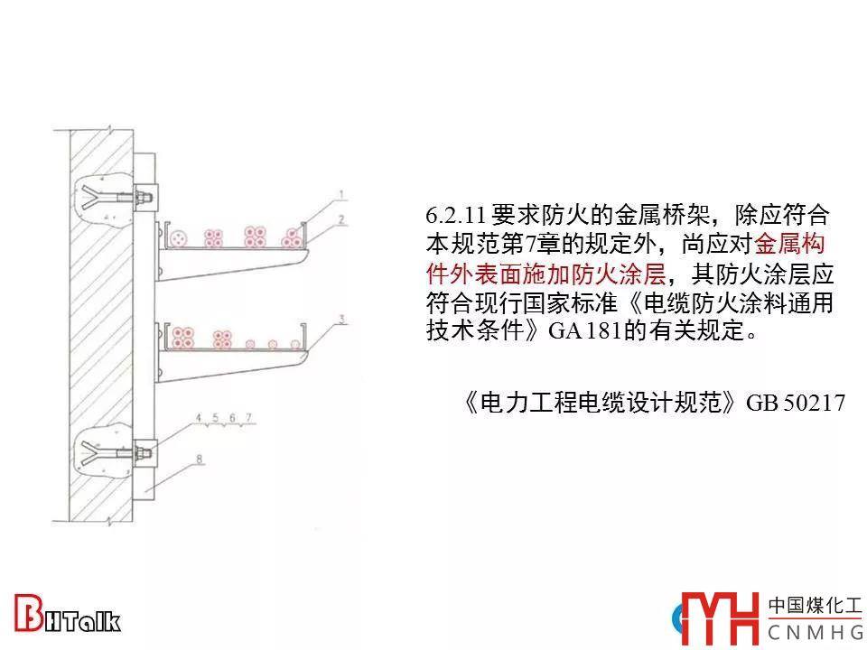 1)要求防火的金屬橋架,應對金屬構件外表面施加防火涂層,其防火涂層應符合現(xiàn)行國家標準《電纜防火涂料通用技術條件》GA 181的有關規(guī)定。