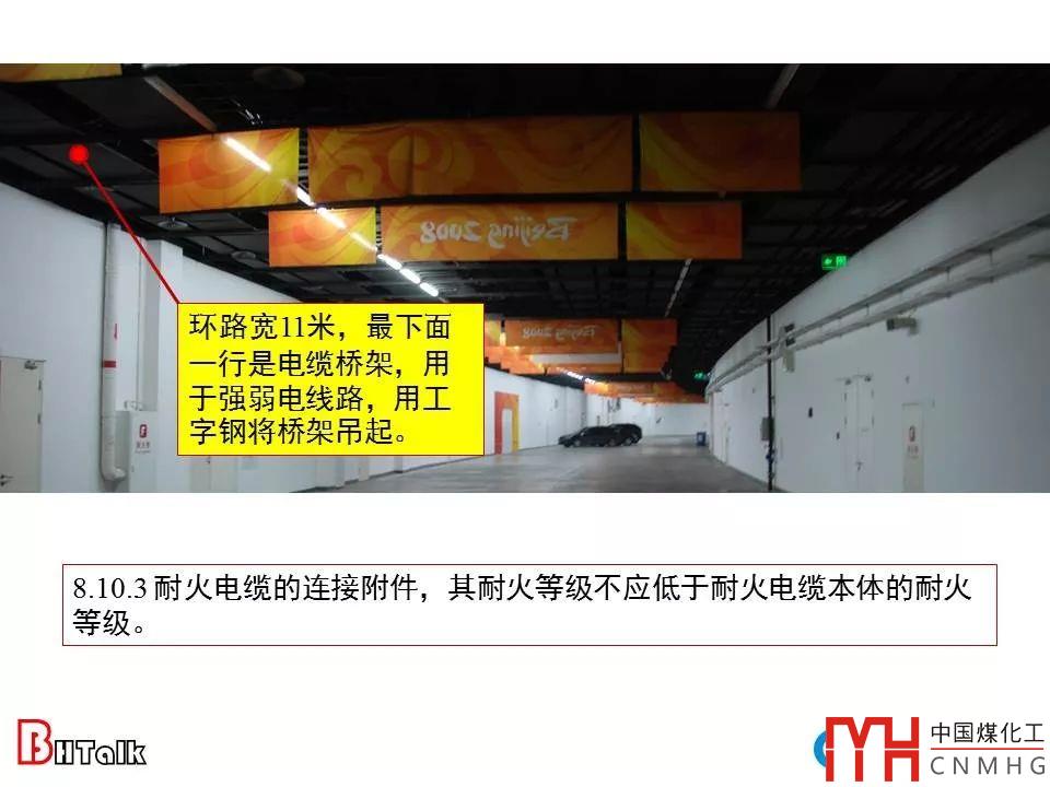 下面的例子是鳥巢電纜及其配件的要求,環(huán)路寬11米,最下面一行是電纜橋架,用于強弱電線路,用工字鋼將橋架吊起。要求耐火電纜的連接附件(圖中工字鋼、吊桿等),其耐火等級不低于耐火電纜本體的耐火等級。否則,再好的耐火電纜由于吊桿的垮塌也會造成消防線路中斷供電!