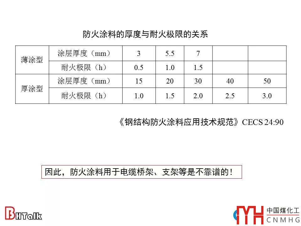 由上表可知,要達到3h的耐火極限,厚涂型的防火涂料涂層厚度高達50mm,是橋架板材厚度的數(shù)倍、甚至十幾倍。因此,防火涂料用于電纜橋架、支架等是不靠譜的做法,也是敷衍了事的做法!