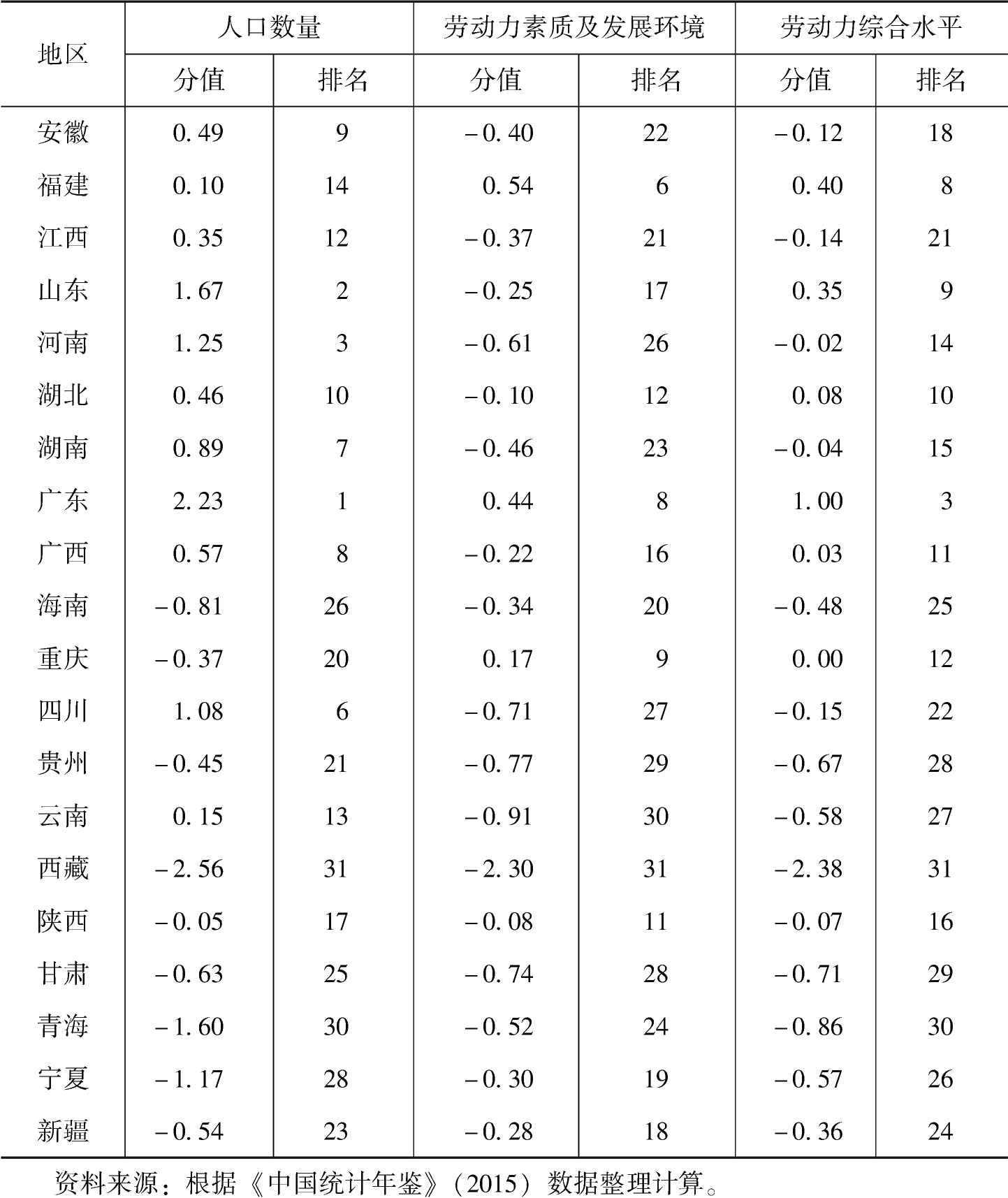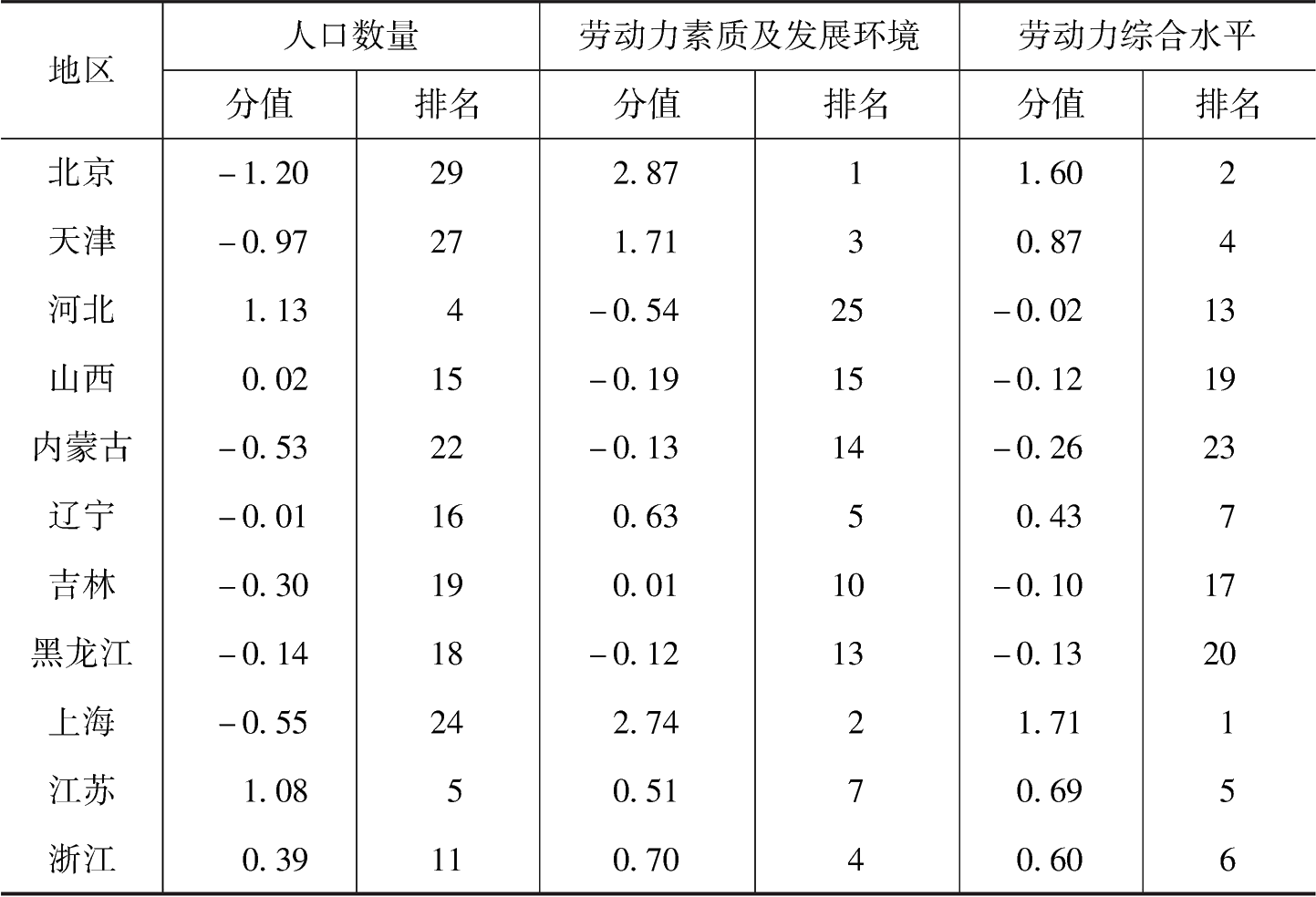 本書利用IBM SPSS20.0軟件中的因子分析功能,分別處理以上5個(gè)指標(biāo),結(jié)果表明,人口數(shù)量因子對(duì)總方差的解釋占比25.23%,而勞動(dòng)者素質(zhì)及發(fā)展環(huán)境因子占比55.21%,這一數(shù)據(jù)表明地區(qū)勞動(dòng)力綜合水平在很大程度上取決于勞動(dòng)者的素質(zhì)以及發(fā)展環(huán)境。表5-6為我國(guó)31個(gè)地區(qū)勞動(dòng)力要素的綜合比較。