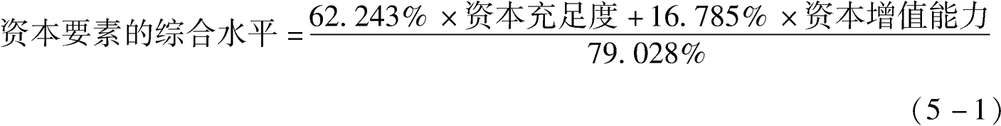通過表5-3的分析,可以得知相比較而言,A、B、C、D、G五個(gè)指標(biāo)對(duì)因子1均有一定程度的影響,這反映出資本充足度的情況,也就是資本數(shù)量。而E和F兩個(gè)指標(biāo)則主要影響因子2,其余指標(biāo)均是略微影響,這反映出了資本的增值能力,或者說是資本的使用效率。以這兩個(gè)因子對(duì)方差的貢獻(xiàn)率占這兩個(gè)因子之和對(duì)總方差的貢獻(xiàn)率的比重為權(quán)重,各地區(qū)資本要素的綜合水平則可以反映出來,計(jì)算公式如下: