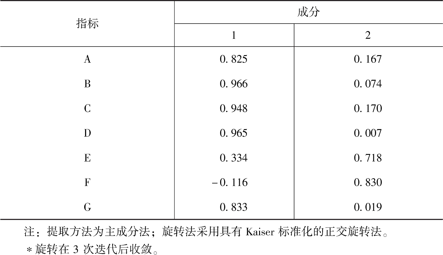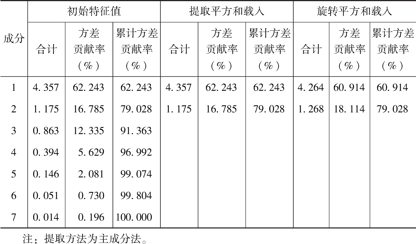 本書的測(cè)算采用的是因子分析法,對(duì)上述7個(gè)指標(biāo)具體使用IBM SPSS20.0軟件中的因子分析功能進(jìn)行處理。由表5-2可以看出,有2個(gè)特征值大于1的公共因子,而這2個(gè)公共因子對(duì)樣本累計(jì)方差貢獻(xiàn)率達(dá)79.028%。