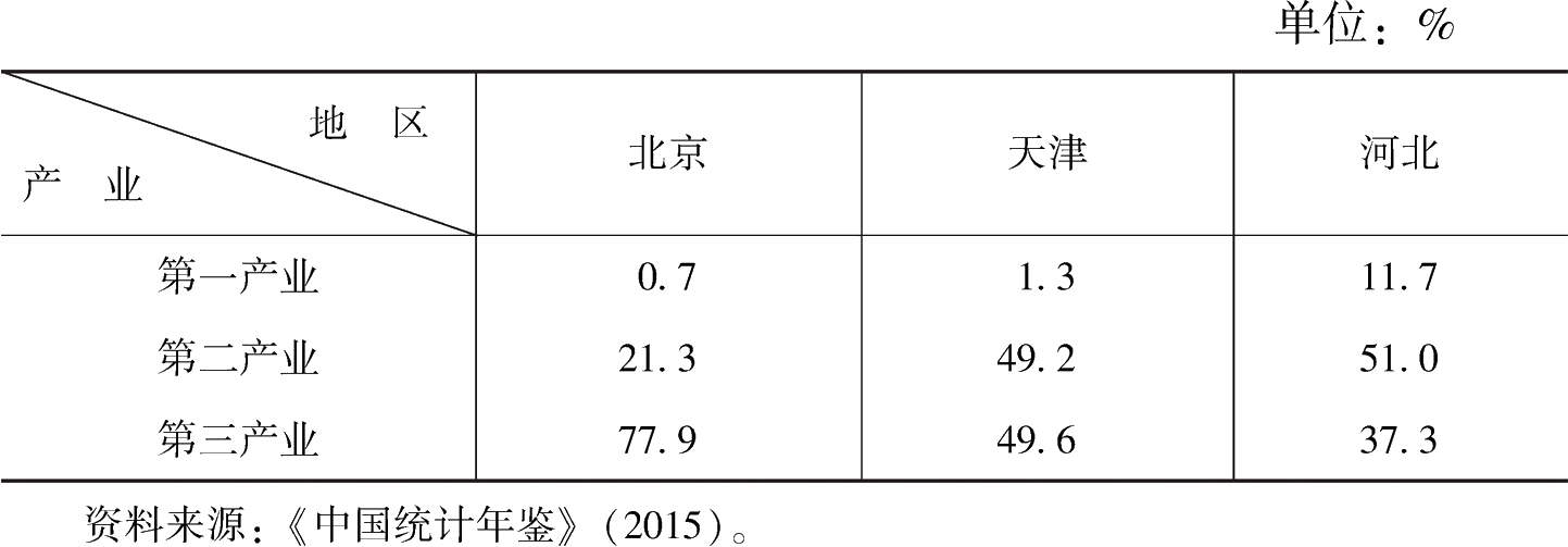 京津冀三地2014年三次產(chǎn)業(yè)比值如表5-9所示。