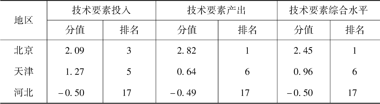 通過對(duì)比各個(gè)地區(qū)的技術(shù)要素水平可以看出,北京處于京津冀經(jīng)濟(jì)圈的領(lǐng)先地位,技術(shù)投入方面與技術(shù)產(chǎn)出方面均是如此,因?yàn)楸本┦俏覈?guó)很多重大技術(shù)創(chuàng)新的發(fā)源地,擁有較強(qiáng)的科技實(shí)力。北京的技術(shù)投入與產(chǎn)出分別位于全國(guó)的第3名及第1名,因此北京理應(yīng)作為京津冀地區(qū)的技術(shù)研發(fā)中心。天津作為京津冀經(jīng)濟(jì)圈的次中心,其實(shí)力也不容小覷,技術(shù)要素投入與產(chǎn)出分別排在全國(guó)的第5名及第6名,其綜合水平在全國(guó)排到第6名。然而河北省的技術(shù)水平則遠(yuǎn)低于北京、天津,它的技術(shù)要素投入與產(chǎn)出均排在全國(guó)第17名,綜合水平為全國(guó)第17名。提高區(qū)域整體的科技創(chuàng)新能力需要進(jìn)行技術(shù)要素的大量轉(zhuǎn)移。河北省應(yīng)當(dāng)認(rèn)清自身不足之處,主動(dòng)開展一些活動(dòng)解決自身遇到的困難,可以學(xué)習(xí)北京、天津的先進(jìn)技術(shù),通過開展一些具體的會(huì)議研討、項(xiàng)目合作等方式來提升自己。同時(shí),作為共同的經(jīng)濟(jì)發(fā)展合作伙伴,北京和天津應(yīng)當(dāng)積極參與到河北省的產(chǎn)業(yè)技術(shù)研發(fā)當(dāng)中,可以采取技術(shù)入股等方式,發(fā)揮技術(shù)要素的最大優(yōu)勢(shì),實(shí)現(xiàn)技術(shù)轉(zhuǎn)移和產(chǎn)出能力的不斷提高。