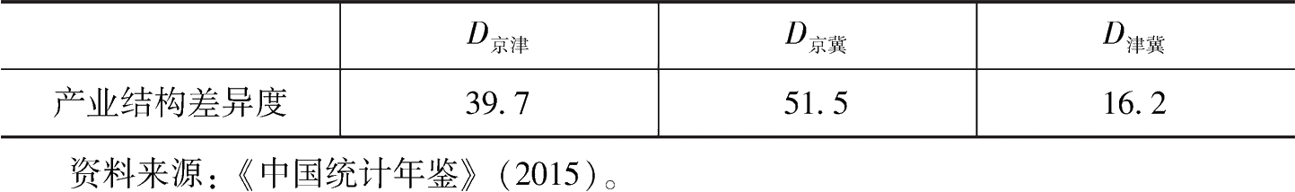京津冀三地2014年相互之間產(chǎn)業(yè)結(jié)構(gòu)差異度計(jì)算結(jié)果如表5-10所示。