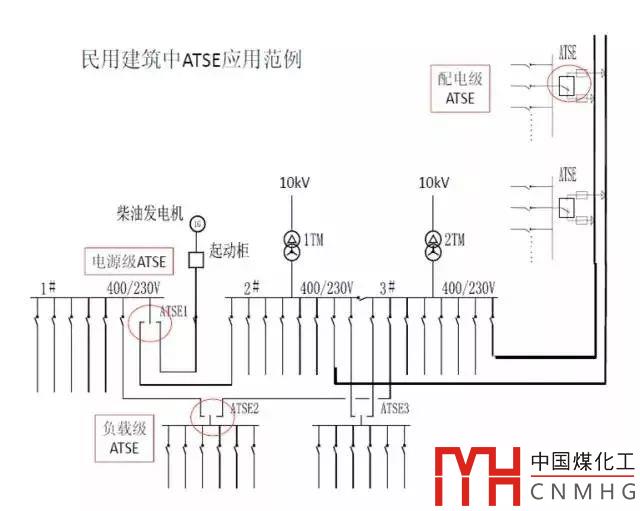 這里講的是ATSE雙電源轉(zhuǎn)換級數(shù),沒有涉及到母聯(lián)開關(guān)轉(zhuǎn)換。使用ATSE轉(zhuǎn)換一般不超過兩級,如圖1所示,第一級為市電與柴油發(fā)電機組之間的電源轉(zhuǎn)換,這是電源級ATSE;第二級可以是配電級ATSE,也可以是負載級ATSE。如果ATSE級數(shù)過多,配合將會紊亂,反而達不到預(yù)期的目標。
