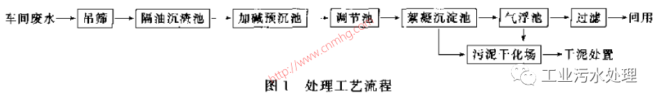 確定處理工藝之前,已在實(shí)驗(yàn)室、生產(chǎn)現(xiàn)場(chǎng)進(jìn)行了多次實(shí)驗(yàn),結(jié)合處理設(shè)施建設(shè)場(chǎng)地、廢水特征等因素,并根據(jù)設(shè)施試運(yùn)行出現(xiàn)的問題,不斷調(diào)整與改進(jìn),最終處理工藝流程如圖1所示。