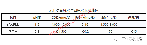 進(jìn)入廢水處理的廢水包括生產(chǎn)工段廢水、車間沖洗廢水和松脂保養(yǎng)廢水。生產(chǎn)工段排水量約1.3m3/t松香,占廢水總量的80%,內(nèi)含成分復(fù)雜,污染物濃度高?;旌蠌U水的CODcr、SS、油脂和Fe2+等指標(biāo)均較高,B/C值小于0.1?;谔幚砉に嚳尚行浴⑻幚沓杀炯吧a(chǎn)用水水質(zhì)要求等方面的綜合考慮,廠方要求廢水經(jīng)處理后全部回用生產(chǎn)?;旌蠌U水與回用水水質(zhì)指標(biāo)見表1。
