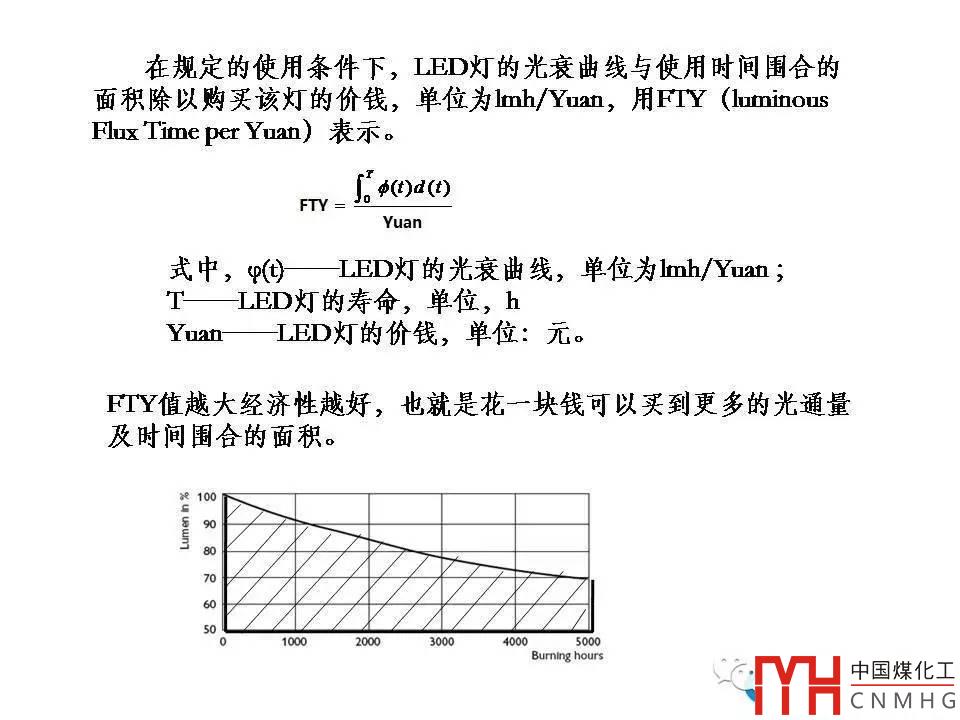 在規(guī)定的使用條件下,LED燈的光衰曲線與使用時間圍合的面積除以購買該燈的價錢,單位為lmh/Yuan,用FTY(luminous Flux Time per Yuan)表示。