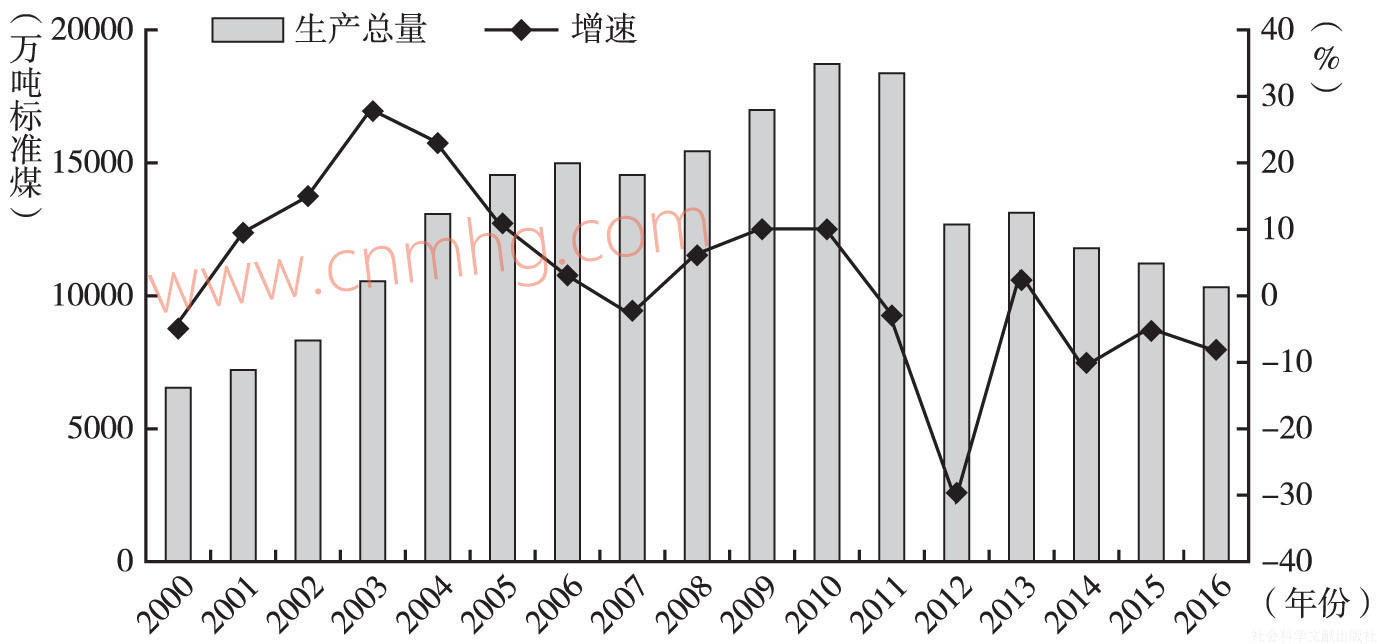 能源生產(chǎn)總量呈下降態(tài)勢,降幅明顯。河南是我國傳統(tǒng)能源大省,“多煤、少油、乏氣”的資源稟賦條件,決定了河南省以煤炭為主的能源結(jié)構(gòu)??傮w上看,隨著省內(nèi)煤炭行業(yè)的發(fā)展,全省能源生產(chǎn)總量呈現(xiàn)“先升后降”的變化趨勢(見圖1)。2000~2010年,河南省能源生產(chǎn)總量持續(xù)快速增長,由6591萬噸標(biāo)準(zhǔn)煤上升至17438萬噸標(biāo)準(zhǔn)煤,其中原煤產(chǎn)量由7578萬噸上升至21349萬噸,煤炭占一次能源生產(chǎn)的比重由83.7%上升至92.4%。“十二五”時期以來,受省內(nèi)煤炭資源可開采量下降、開采難度不斷加大,以及我國能源發(fā)展轉(zhuǎn)型升級和供給側(cè)結(jié)構(gòu)性改革持續(xù)推進(jìn)等因素影響,河南能源生產(chǎn)總量總體呈持續(xù)下降態(tài)勢,“十二五”期間年均下降8.4%。煤炭作為河南能源生產(chǎn)的支柱行業(yè),其產(chǎn)量的不斷降低是導(dǎo)致省內(nèi)能源生產(chǎn)總量持續(xù)下滑的根本原因。2015年,河南省能源生產(chǎn)總量為1.12億噸標(biāo)準(zhǔn)煤,同比下降4.8%;初步統(tǒng)計,2016年河南省能源生產(chǎn)總量為1.03億噸標(biāo)準(zhǔn)煤,同比下降8.3%。近期,煤炭行業(yè)在國家化解過剩產(chǎn)能等政策的推動下,市場明顯回暖,2016年前三季度,省屬骨干煤炭企業(yè)商品煤平均綜合售價累計上漲120元/噸左右,企業(yè)經(jīng)營狀況有所好轉(zhuǎn)。但從煤炭市場總體情況看,供大于求的局面并未發(fā)生根本改變,市場下行壓力較大,受全省煤炭行業(yè)去產(chǎn)能工作持續(xù)推進(jìn)影響,未來河南仍將面臨能源生產(chǎn)總量緩慢下降的情況。