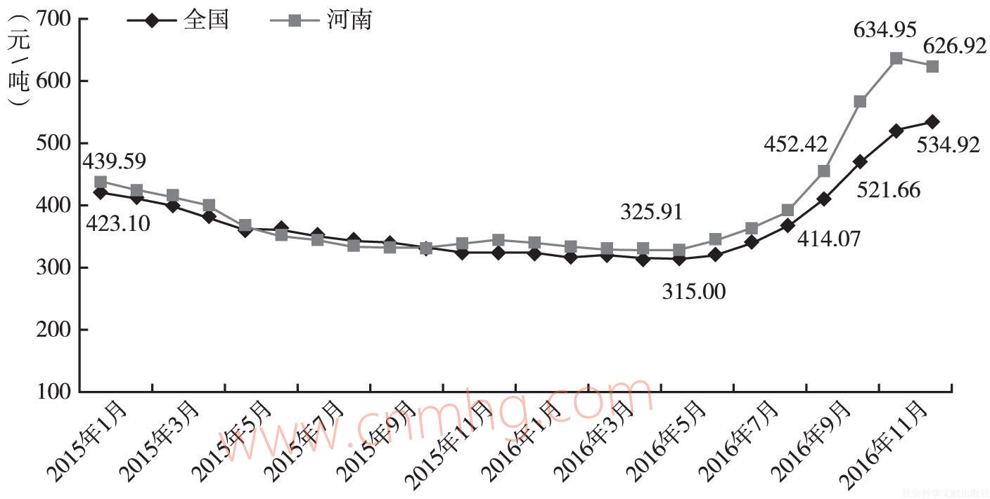 圖9 2015~2016年河南省及全國電煤價格變化情況