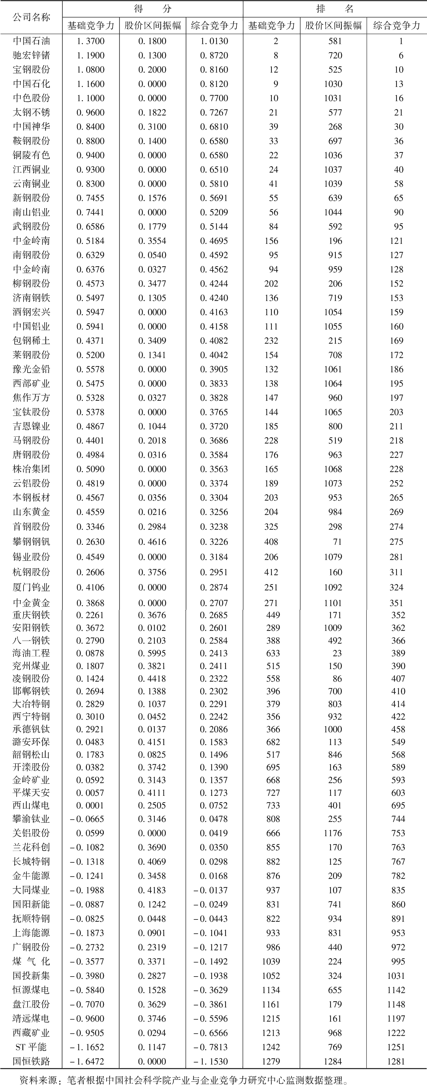 表4-3 滬深兩市采掘與冶煉業(yè)上市公司基礎(chǔ)競爭力與綜合競爭力得分與排名