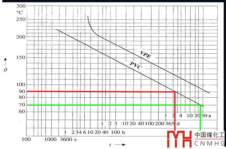 如果用小截面電纜代替,電纜的載流量不足,電纜長(zhǎng)期處于過(guò)載狀態(tài),電纜絕緣過(guò)熱老化加快,導(dǎo)體溫度升高,而保護(hù)電器又不能動(dòng)作,絕緣老化的結(jié)果加速絕緣損壞。圖3所示,導(dǎo)體工作在70℃時(shí)電纜壽命可達(dá)30年,導(dǎo)體工作溫度為90℃時(shí)電纜壽命只有不到3年的時(shí)間。結(jié)果容易導(dǎo)致電纜相間短路或者相對(duì)地短路,引發(fā)火災(zāi)風(fēng)險(xiǎn)。