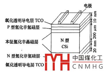 由于傳統(tǒng)的單晶硅太陽(yáng)電池技術(shù)雖然在穩(wěn)定的強(qiáng)光下效率較高,但弱光性能相對(duì)較差。針對(duì)這種缺點(diǎn),近年來(lái)在傳統(tǒng)N型單晶硅太陽(yáng)電池的基礎(chǔ)上研發(fā)出來(lái)一種稱為異質(zhì)結(jié)電池的新型太陽(yáng)電池,所謂異質(zhì)結(jié)結(jié)構(gòu)就是在P型氫化非晶硅和N型氫化非晶硅與N型硅襯底之間增加一層非摻雜(本征)氫化非晶硅薄膜,采取該工藝措施后,改變了PN結(jié)的性能。它兼有單晶硅電池在強(qiáng)光下效率穩(wěn)定性的優(yōu)點(diǎn),又有薄膜電池在弱光下性能好的特點(diǎn),光電轉(zhuǎn)換效率可提高到16%以上,其結(jié)構(gòu)示意圖如圖2所示。