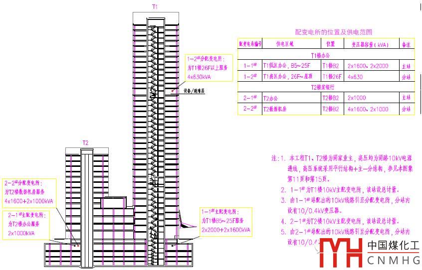 由于建筑高度高、建筑規(guī)模大,配變電所的設(shè)置不僅在地下層,樓上也有可能設(shè)置配變電所,樓上配變電所一般設(shè)置在避難層或設(shè)備層?!冻邔咏ㄖ姎庠O(shè)計(jì)與安裝》14D801建議樓上的配變電所的三相變壓器容量不超過1250kVA,變壓器的高度不宜超過2.4m,不推薦35kV的配電變壓器設(shè)在樓上的配變電所,便于垂直運(yùn)輸和減輕樓面荷載。