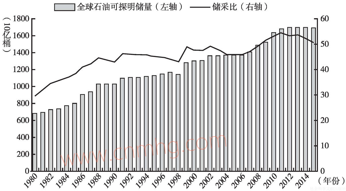 圖4.2 全球石油可探明儲(chǔ)量及儲(chǔ)采比(1980~2015年)