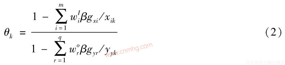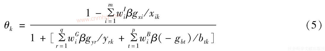 θk可以直接用于衡量效率。其中,wiI表述對第i種投入的權(quán)數(shù),wrG為第r種合意產(chǎn)出的權(quán)數(shù),wtB為第t種非合意產(chǎn)出的權(quán)數(shù)。上述權(quán)數(shù)的作用在于體現(xiàn)不同指標(biāo)的重要程度,可構(gòu)造權(quán)重矩陣(w1I,w2I,w3I,wG1,wB1,w2B,w3B)。