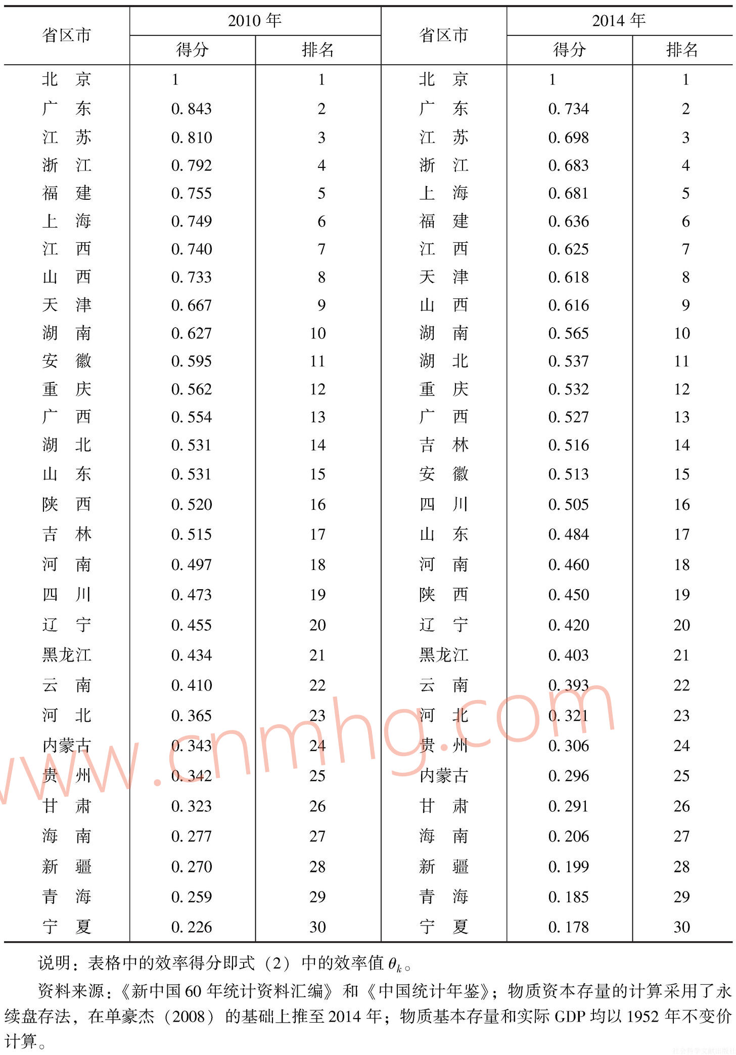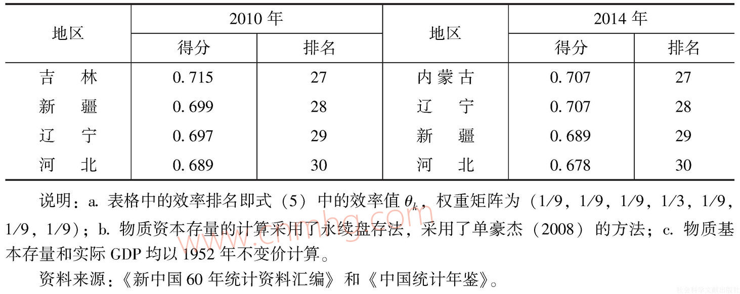 θk可以直接用于衡量效率。其中,wiI表示對第i種投入的權(quán)數(shù);而wrO為第r種產(chǎn)出的權(quán)數(shù),體現(xiàn)不同指標(biāo)的重要程度,m、q分別指投入和產(chǎn)出的種類數(shù)目,這里m=3,q=1。選取的權(quán)重矩陣(w1I,w2I,w3I,w1O)=(1/6,1/6,1/6,1/2),其含義是將各種投入和產(chǎn)出進(jìn)行均等對待,即投入和產(chǎn)出同等重要,兩者各賦予1/2的權(quán)重;考慮到共有3種投入,將投入部分的權(quán)重進(jìn)一步平均賦予資本、勞動和能源,即各種投入的權(quán)重分別為1/6。