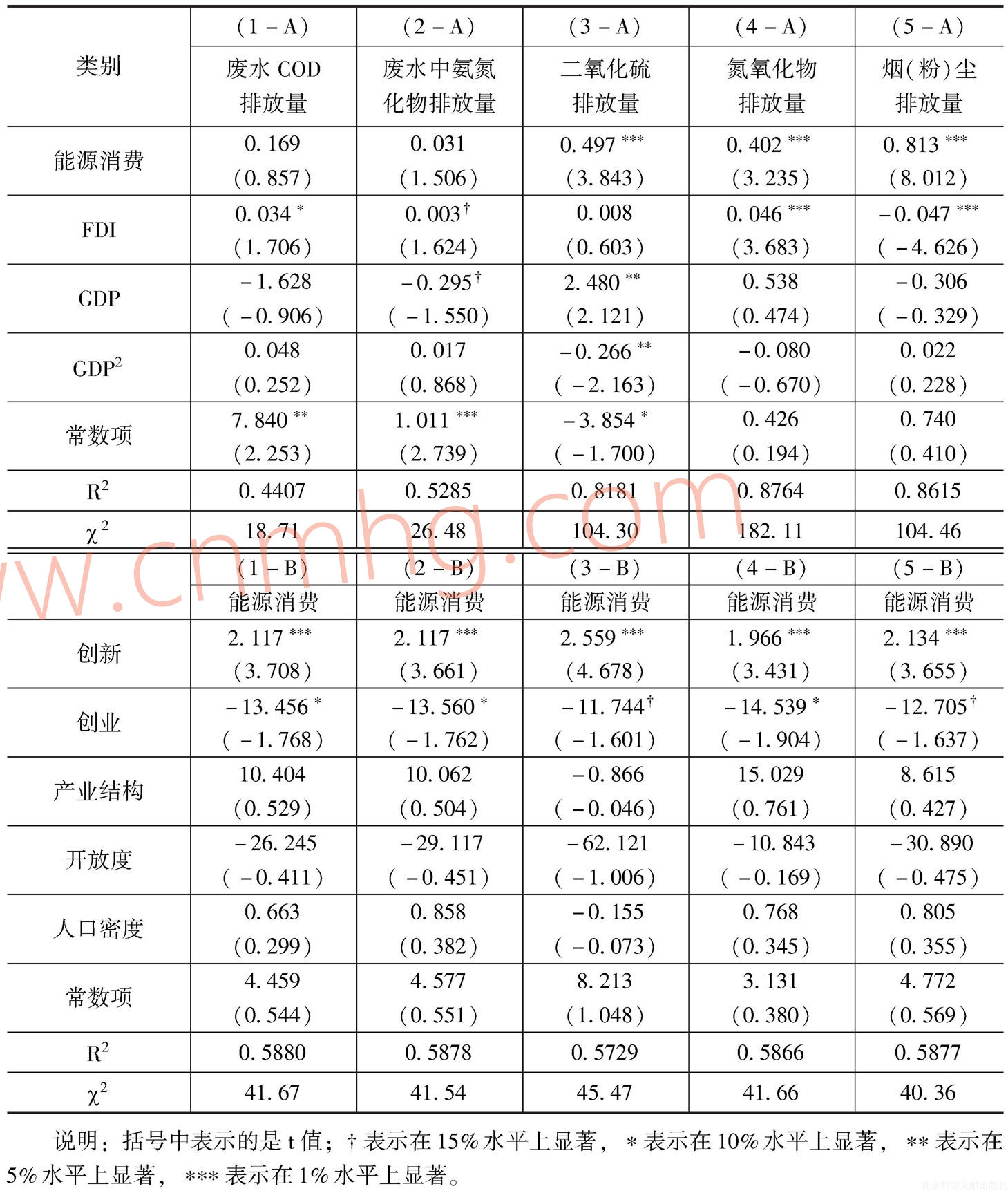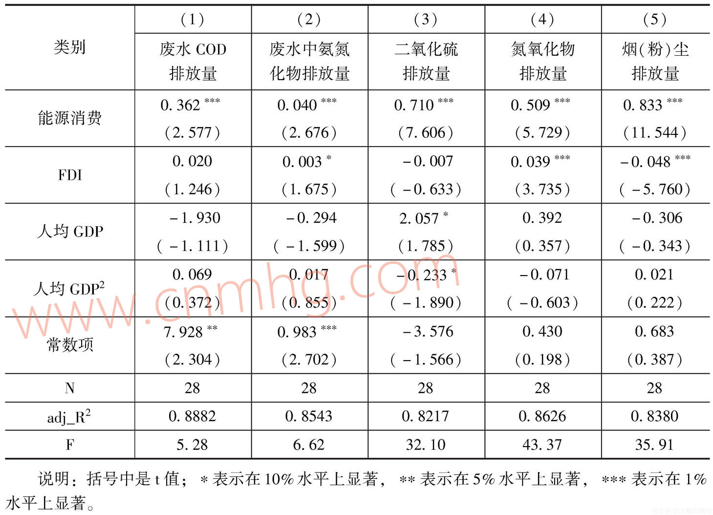 其中,pollution指環(huán)境污染,本文將分別用廢水COD排放量、廢水中氨氮化物排放量、二氧化硫排放量、氮氧化物排放量和煙(粉)塵排放量進(jìn)行衡量;EC是能源消費量,是核心變量;pcgdp指人均GDP。fdi為外商直接投資;ε是隨機(jī)擾動項?;诤幽鲜?8個地級市的能源、環(huán)境數(shù)據(jù),本文對河南省能源消費的環(huán)境影響進(jìn)行模擬測算,結(jié)果詳見表5。