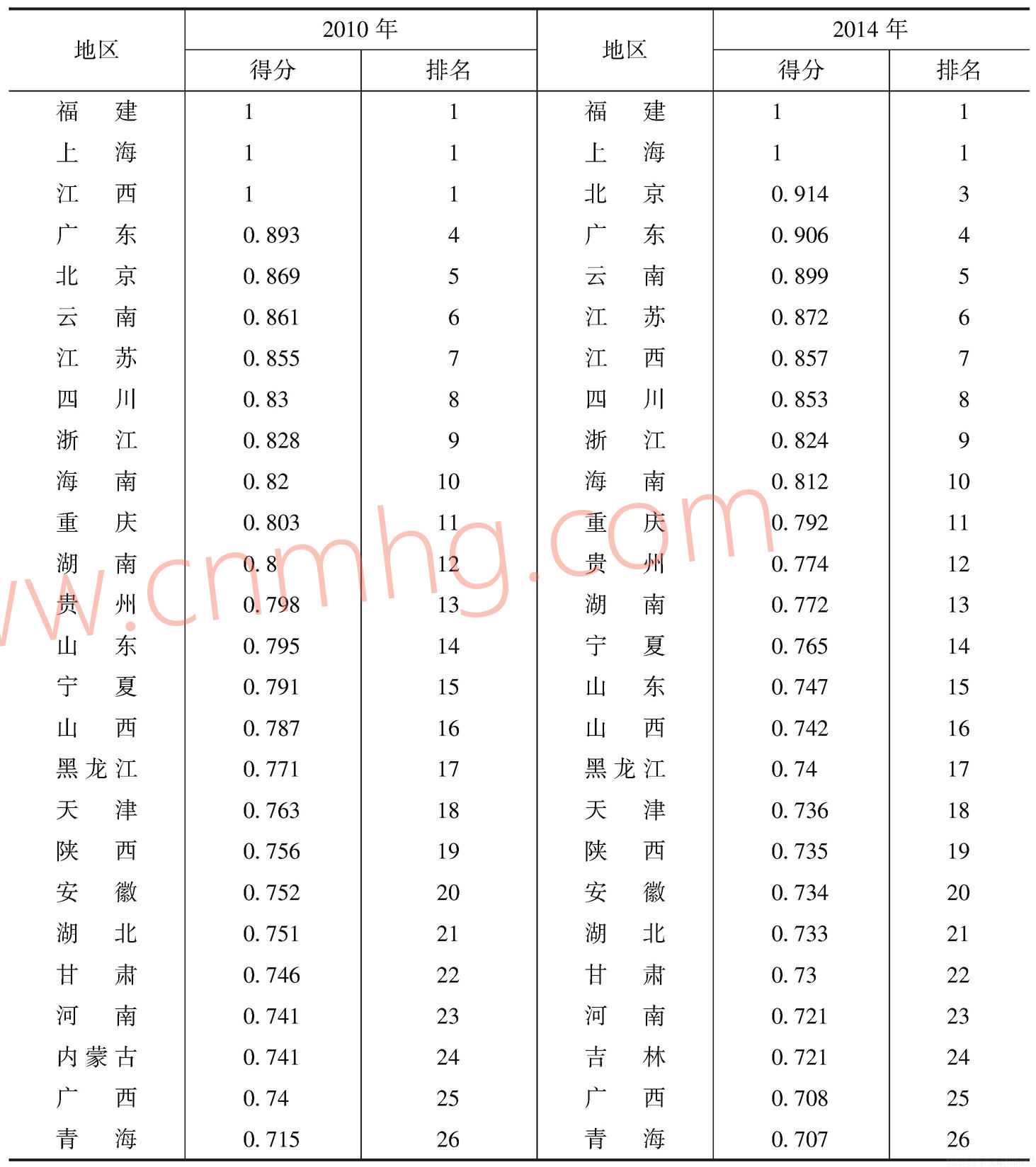 與未考慮環(huán)境約束相比,環(huán)境約束下全國各省區(qū)市的能源效率得分及排名有較大變化。將環(huán)境污染作為非合意的產(chǎn)出后,2010年,福建、上海和江西是處于效率排名前列的省份,即處于能源效率的最佳水平,廣東和北京分列第4、5位,河南列第23位。2014年福建和上海仍然是能源效率最高的省份,隨著北京高耗能行業(yè)外遷,北京市的能源效率提升到第三位,而河南省仍列全國第23位,與全國最優(yōu)水平的差距進(jìn)一步擴(kuò)大(見表6)??梢?,將環(huán)境約束納入評價體系后,河南省的能源效率處于全國落后水平,說明河南省目前的能源利用方式和產(chǎn)業(yè)體系仍然較為粗放與滯后,經(jīng)濟(jì)結(jié)構(gòu)以及能源結(jié)構(gòu)的轉(zhuǎn)型進(jìn)度滯后于全國平均水平,河南省需要加快推進(jìn)產(chǎn)業(yè)結(jié)構(gòu)轉(zhuǎn)型升級,加速提升清潔能源消費比重。