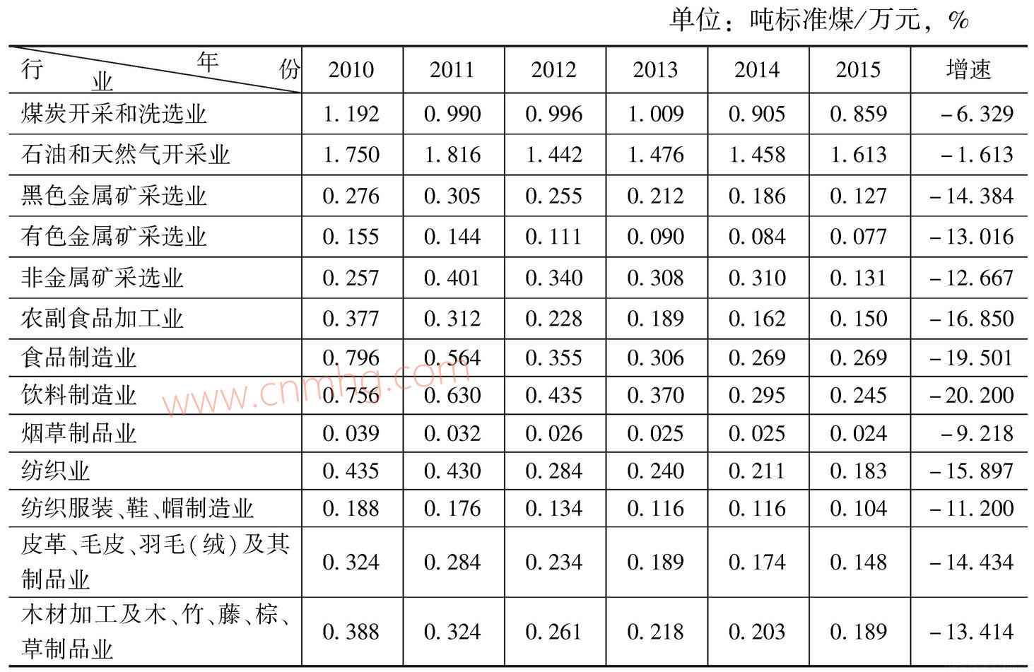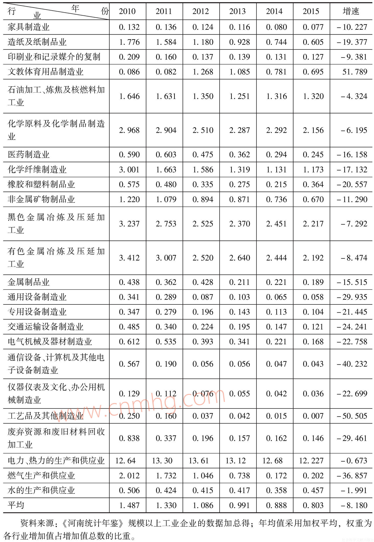 表2 2010~2015年河南省工業(yè)各行業(yè)能源利用效率及其變化
