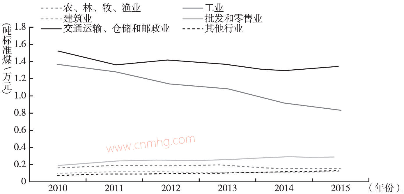 行業(yè)不同其能源利用效率也存在顯著差別。河南省整體能源利用效率的提升主要來自各行業(yè)能耗水平的大幅降低(見表1)。2010年,交通運(yùn)輸、倉儲和郵政業(yè)單位增加值能耗高達(dá)1.535噸標(biāo)準(zhǔn)煤/萬元,是能源利用效率最低的行業(yè);工業(yè)單位增加值能耗為1.373噸標(biāo)準(zhǔn)煤/萬元,能源利用效率排各行業(yè)倒數(shù)第二。至2015年,交通運(yùn)輸、倉儲和郵政業(yè)單位增加值能耗降至1.354噸標(biāo)準(zhǔn)煤/萬元,平均每年下降2.49%;而工業(yè)單位增加值能耗降至0.840噸標(biāo)準(zhǔn)煤/萬元,平均每年降低9.37%,降幅顯著(見圖3)。