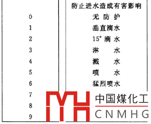 防護(hù)等級(jí)“代號(hào)”用“IP”字母和兩個(gè)特征數(shù)字組成,第一位特征數(shù)字指防護(hù)型式①項(xiàng)中的防護(hù)等級(jí),第二位特征數(shù)字指防護(hù)型式②項(xiàng)中的防護(hù)等級(jí),其特征數(shù)字含義見表1,③項(xiàng)中所述防護(hù)型式稱為防濕型,是指電器能在相對(duì)濕度為90%以上的濕氣中正常工作。