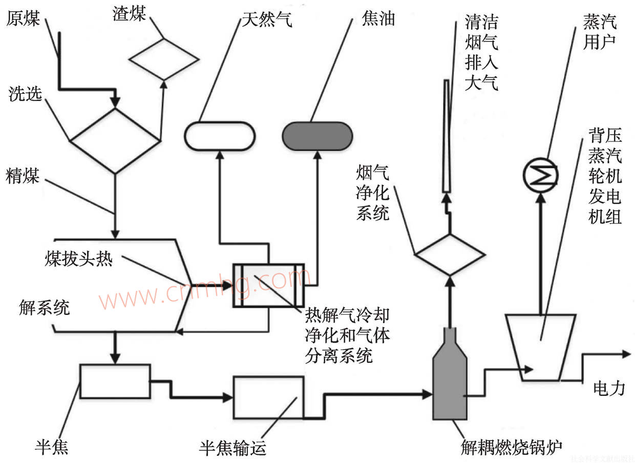 使用標(biāo)準(zhǔn)化的潔凈煤做燃料,采用解耦燃燒的新型高效鍋爐和脫硫除塵一體化煙氣超凈化裝置的蒸汽清潔生產(chǎn)系統(tǒng),實(shí)現(xiàn)背壓式汽輪機(jī)發(fā)電機(jī)組熱電聯(lián)產(chǎn),堅(jiān)持對(duì)污染前端治理、優(yōu)先集中清潔治理、實(shí)現(xiàn)全過程治理的治污流程,建立市場(chǎng)化建設(shè)、專業(yè)化運(yùn)營和管理的為中小企業(yè)服務(wù)的清潔能源生產(chǎn)服務(wù)中心,這五位一體構(gòu)成了一個(gè)完整的工業(yè)鍋爐清潔生產(chǎn)體系,能實(shí)現(xiàn)工業(yè)鍋爐清潔生產(chǎn),確保煤炭的清潔利用,推動(dòng)我國能源生產(chǎn)和消費(fèi)方式革命,這是貫徹黨的十八大精神,建設(shè)生態(tài)文明國家的實(shí)際行動(dòng)。圖2為煤炭洗選、“煤拔頭”熱解解耦燃燒、背壓發(fā)電全過程示意。