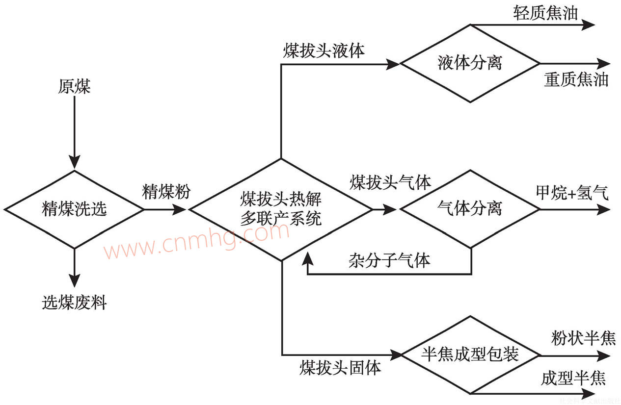 “煤拔頭”的設(shè)想是中國科學(xué)院過程工程研究所提出的,“拔頭”原是石油加工工業(yè)中的術(shù)語,意思是從原油中蒸出輕油組分。“煤拔頭”,旨在常壓、中低溫、無催化劑和氫氣的條件下,用溫和熱解的方式,在煤的快速熱解過程中,將原煤中的成分按照液體、氣體、固體三種物質(zhì)形態(tài)分離開來,液體成分可用做化工原料或煉油原料生產(chǎn)清潔液體燃料,氣體成分可以分離出甲烷和氫氣生產(chǎn)煤基清潔氣體燃料、替代天然氣,固體成分——半焦進(jìn)一步處理加工成清潔固體燃料?!懊喊晤^”熱解工藝,可以聯(lián)產(chǎn)氣、液、固三種清潔燃料,實(shí)現(xiàn)煤炭的多級(jí)利用,并借此工藝脫硫脫硝,符合中國的國情。其工藝產(chǎn)品思路由下圖所示。