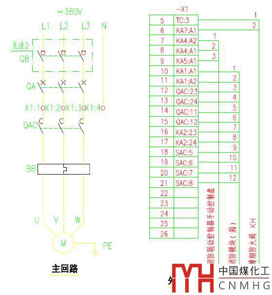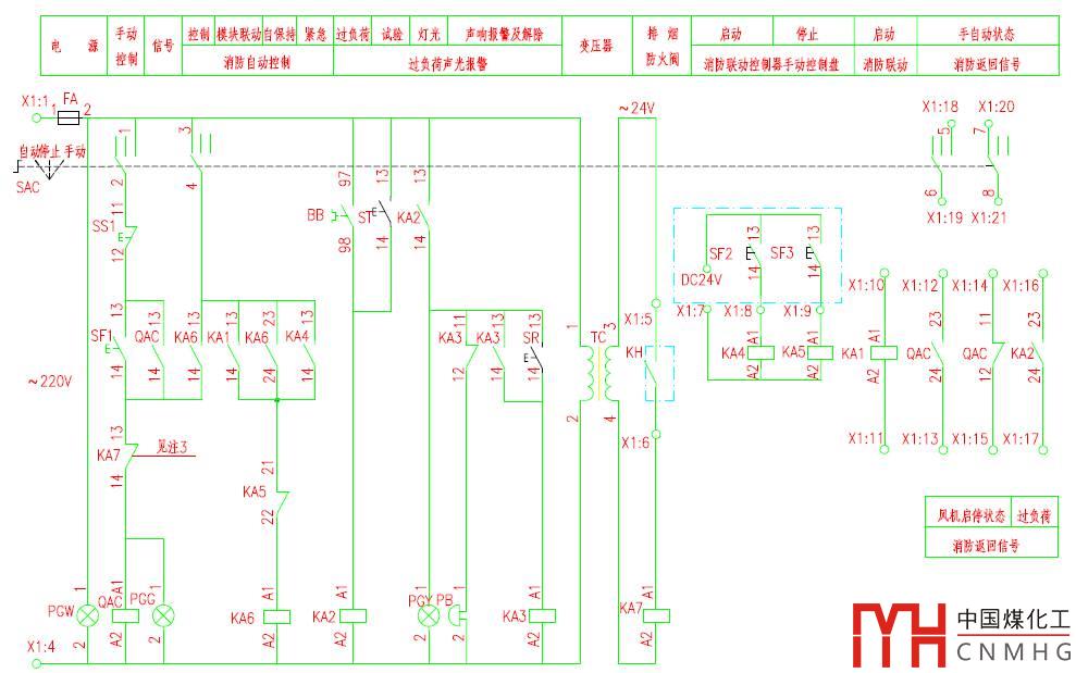 控制線路b有12芯線,分別為2芯消防自動(dòng)控制(KA1,通過(guò)消防控制模塊),4芯反饋風(fēng)機(jī)運(yùn)行狀態(tài)(QAC),2芯過(guò)負(fù)荷信號(hào)(KA2),手自動(dòng)轉(zhuǎn)換開(kāi)關(guān)位置狀態(tài)(SAC)。