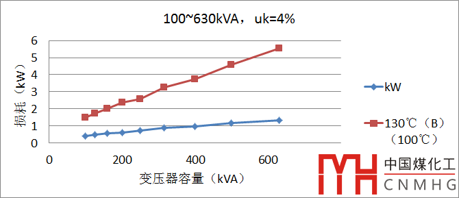 圖1 變壓器容量100~630kVA、阻抗電壓uk=4%的空載損耗(Po)和負(fù)載損耗(Pk)